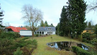 Das Haus steht leicht erhöht über dem ansonsten ebenen, weitläufigen Garten, er ist ursprünglich gärtnerisch gestaltet worden, hat aber in den letzten Jahren nicht mehr die Aufmerksamkeit erhalten, die er verdient. Die pflegeleichte Rasenfläche ist umringt von einigen Staudenbeeten, die zum Teil von Lavendel- oder Buchsbaumhecken begrenzt werden. Weiter hinteren gibt es einen Gartenteich. Das Grundstück ist im rückwärtigen Teil leicht bewaldet, wobei es sich hier nicht um Wald, sondern um Ackerland handelt. Die Terrasse ist sehr groß, wunderbar geschützt und hat einen tollen Blick über den Garten.
